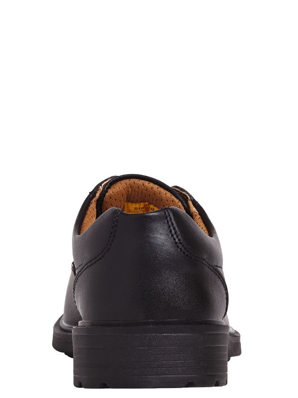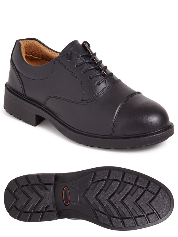 Black smooth leather safety shoe. Padded collar for added comfort. Steel toe cap and composite midsole protection. Moisture wicking inner lining. Dual density polyurethane outsole. Anti-static. A lightweight executive style uniform shoe for lighter duties.