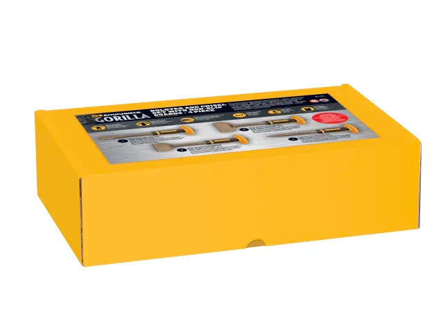 Roughneck 4 Piece Bolster & Chisel Set with Non-Slip Guards is manufactured from drop-forged and heat-treated superior quality chrome vanadium steel to ensure outstanding toughness and long-life performance. The 45° single chamfer cutting edge offers the optimal balance between cutting performance and longevity. Each piece is equipped with a patented non-slip guard that securely locks onto the shaft. Eliminates the age-old problem of grips slipping up the shaft during impact. Additionally, the guard can be removed within seconds to improve access in tight areas or to aid flush cutting.
